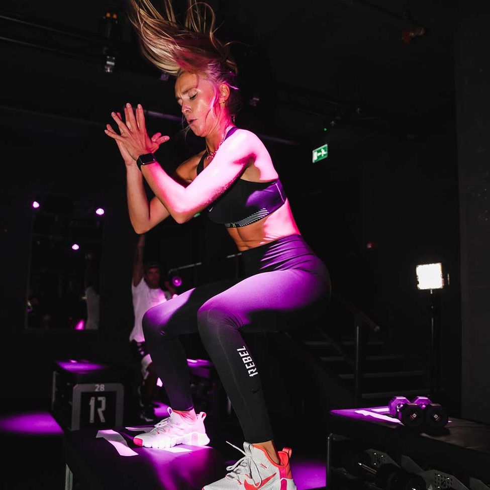 Enter our most renowned full body workout, and go into full on sweat mode as you continually switch between the treadmill and 1Rebel box, which comes complete with a full set of dumbbells.